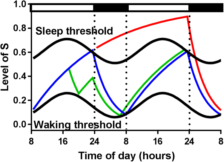 Il est important de noter que le processus homéostatique est théoriquement déconnecté du processus circadien, qui se manifeste de jour en jour indépendamment du sommeil effectivement obtenu. À titre d’illustration, la période de somnolence post-prandiale est souvent observée aux alentours de 14h, effet que les études s’accordent à attribuer au rythme circadien plutôt qu’à la prise alimentaire. C’est l’interaction des processus circadien et homéostatique qui aboutit aux horaires de lever et de coucher propres à chaque individu. C’est également pourquoi, même après une nuit blanche où la pression de sommeil est considérable, la reprise du rythme circadien aide à maintenir l’éveil pendant la journée.